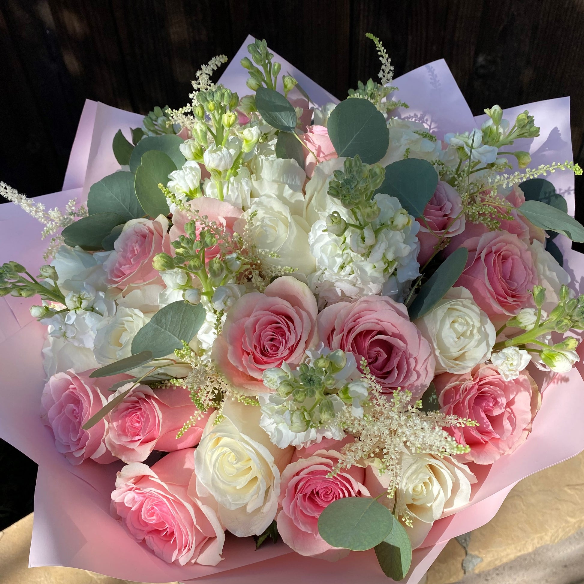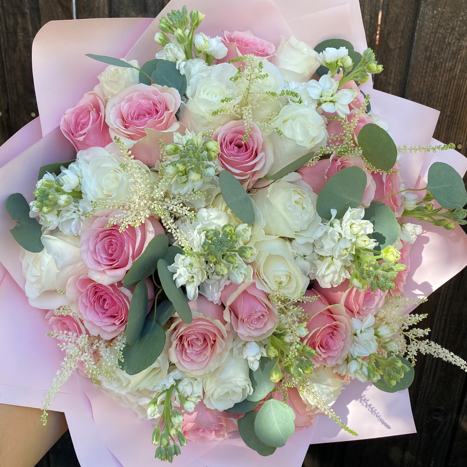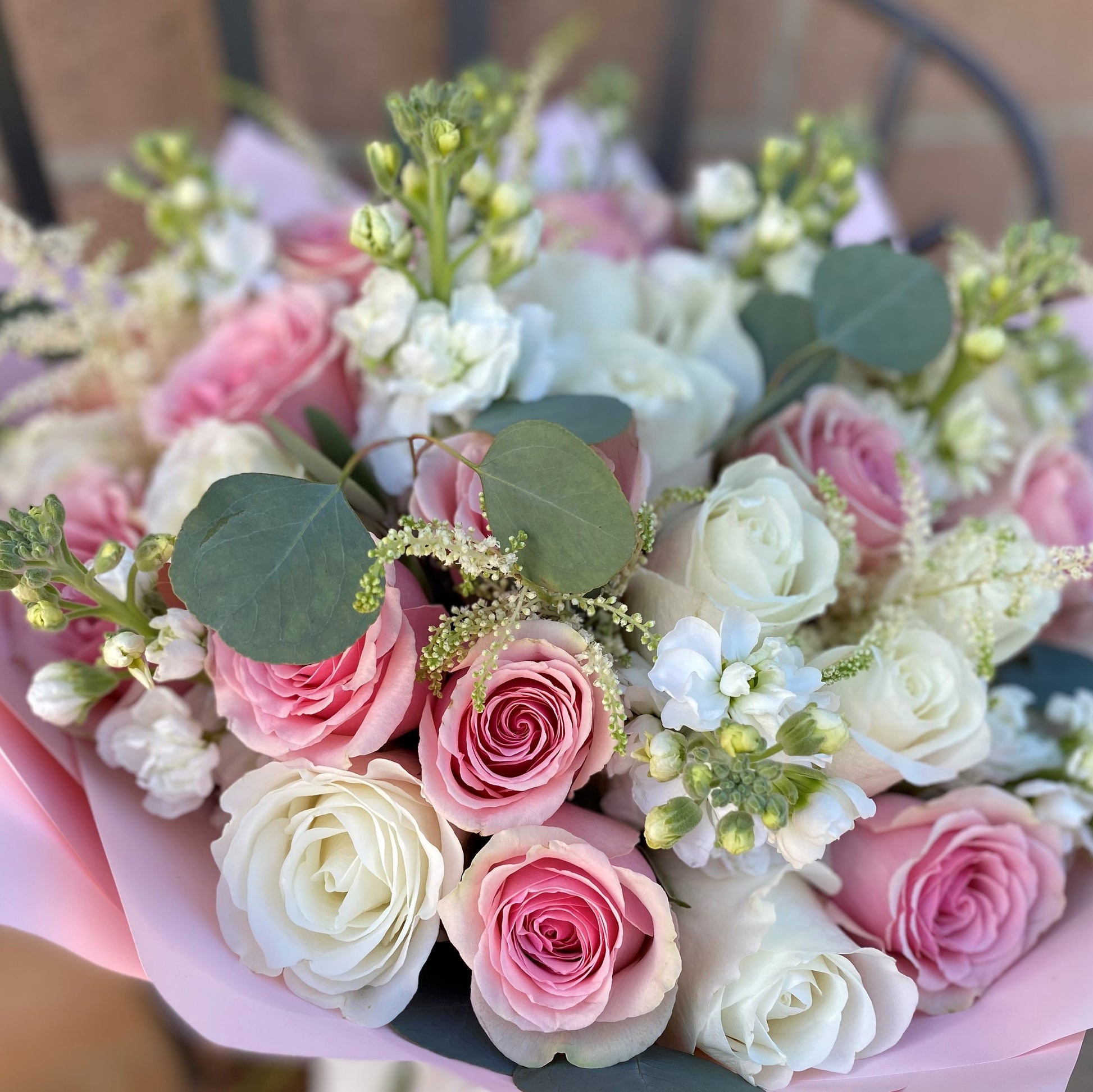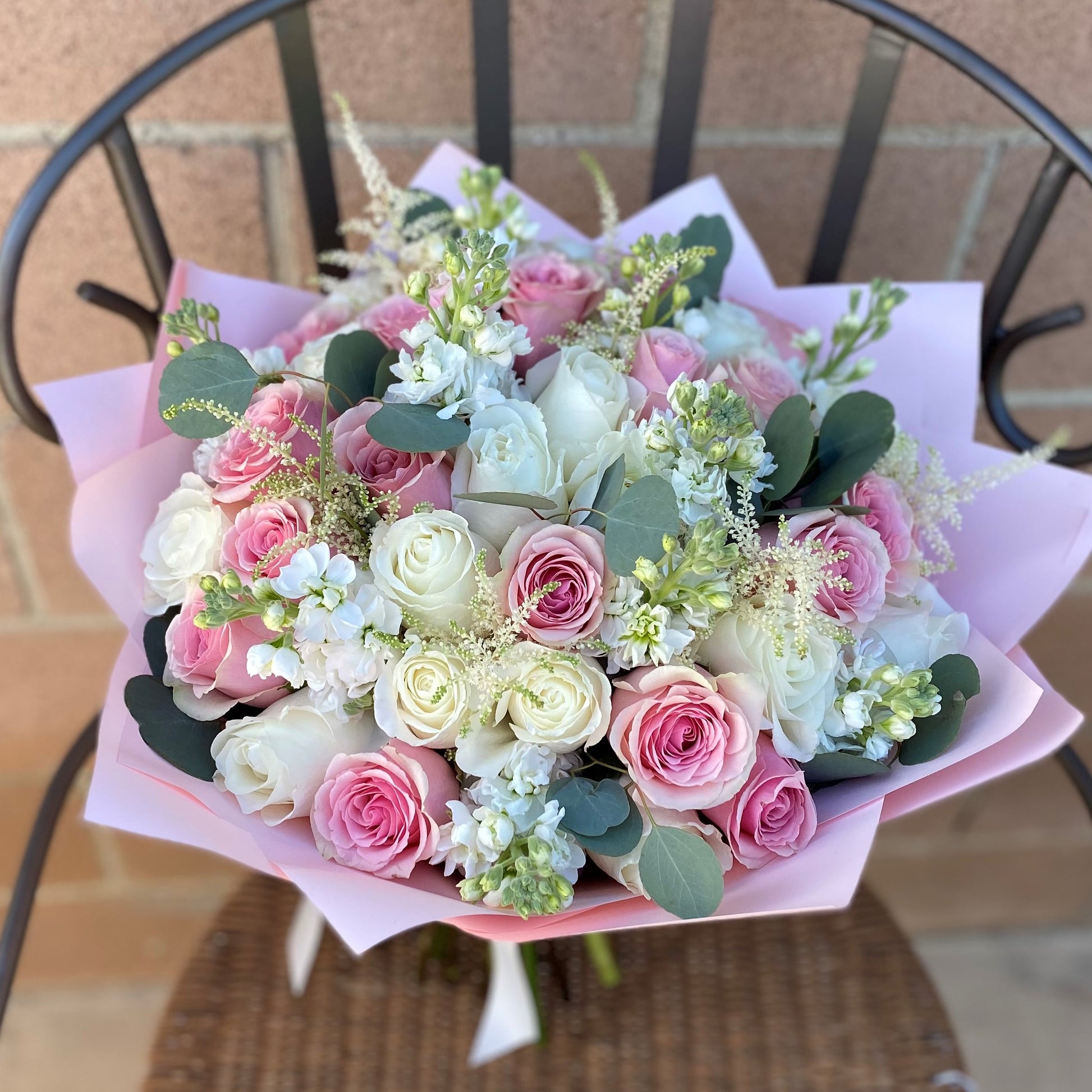 Bouquet of mixed white and pink flowers with green accents. Vase not included.