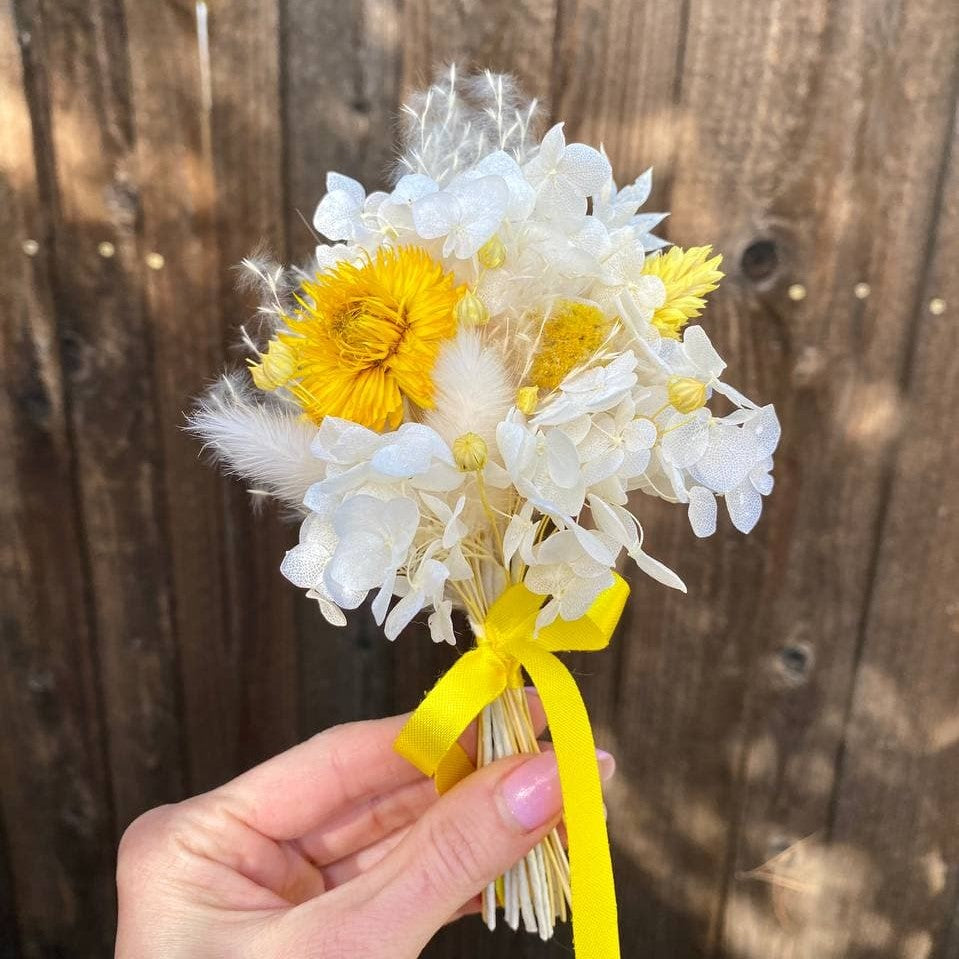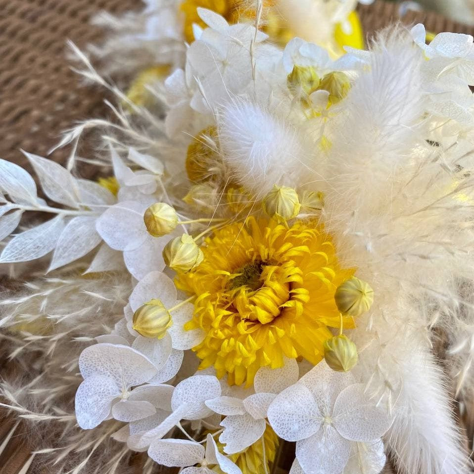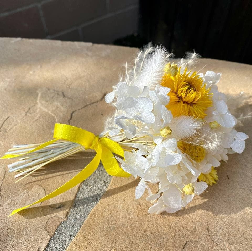 Handmade mini dried flower bouquet for gift, table setting, wedding and home decorations. Yellow & Neutral palette. Mini Dried Flower for Boutonniere.