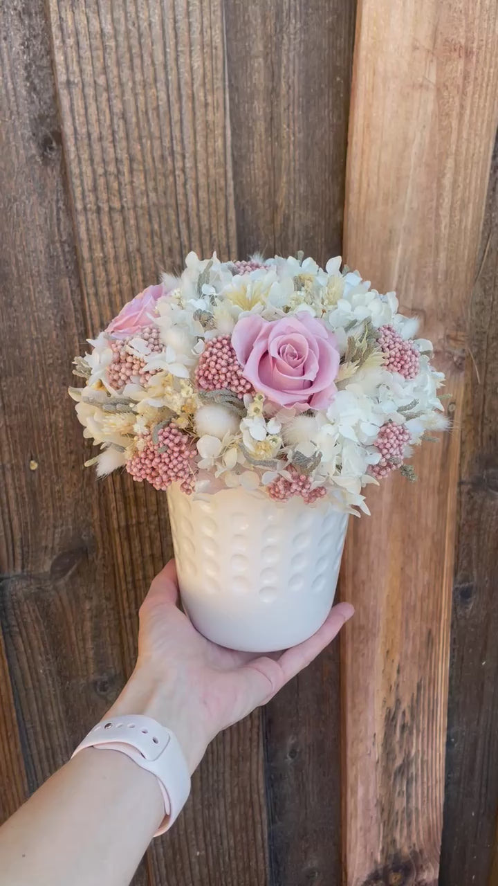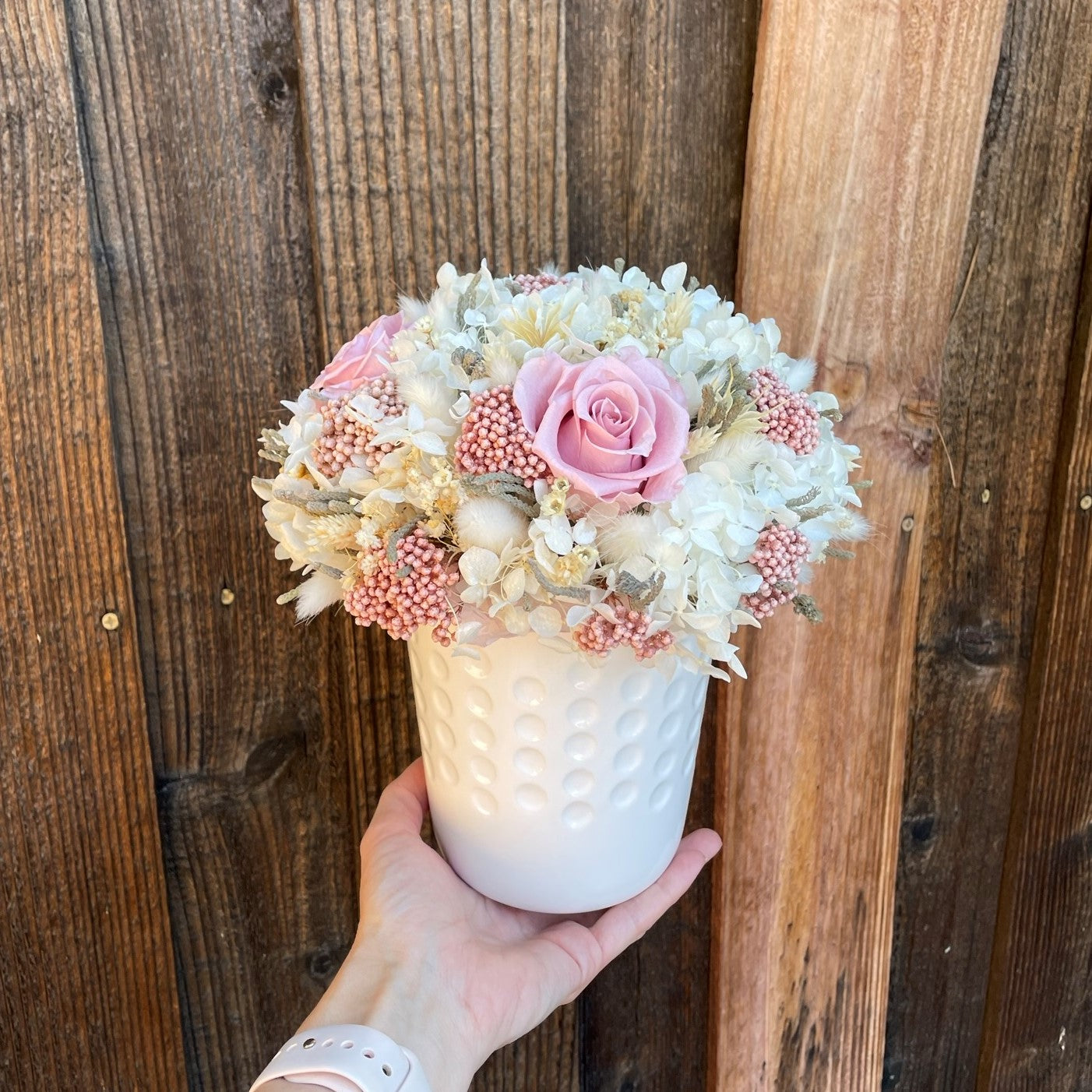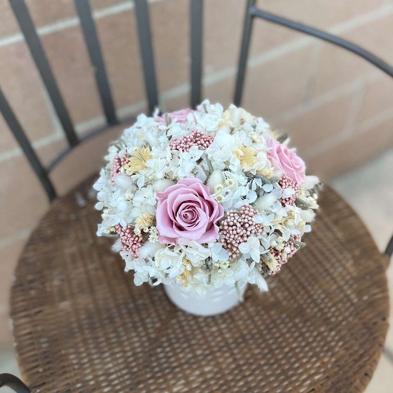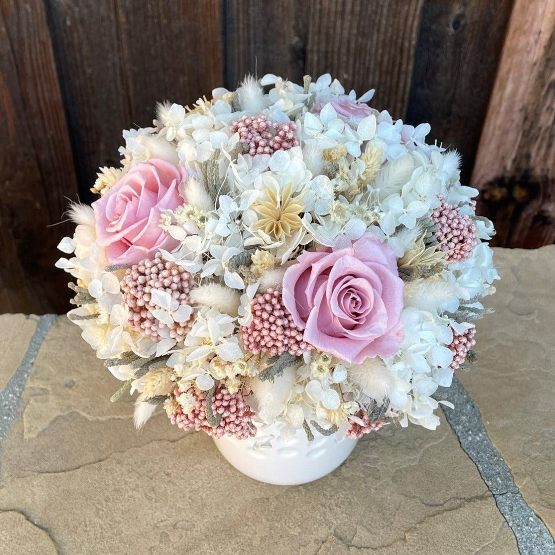 Luxury Flower Arrangement with Preserved Roses and Dried flowers. Perfect Gift. Cute pink and white Birthday custom woman gift Everlasting Flowers.