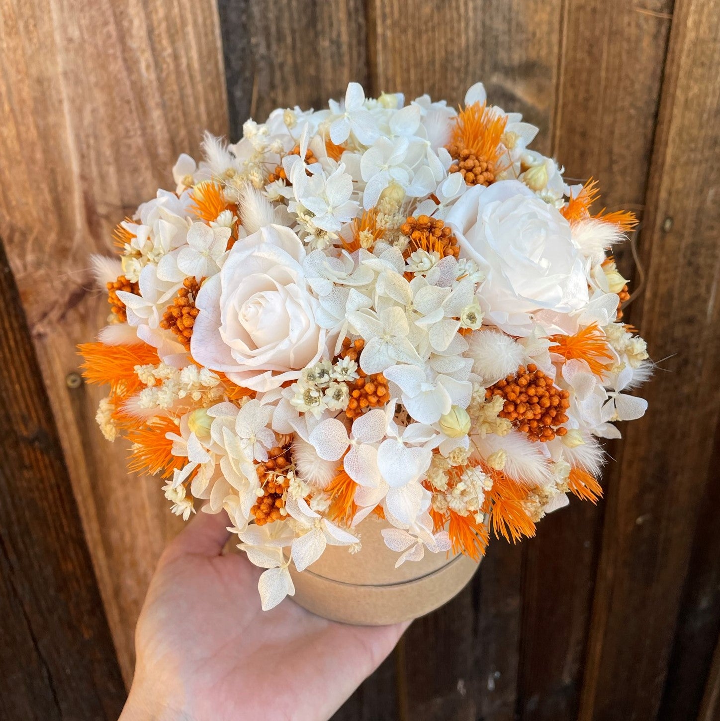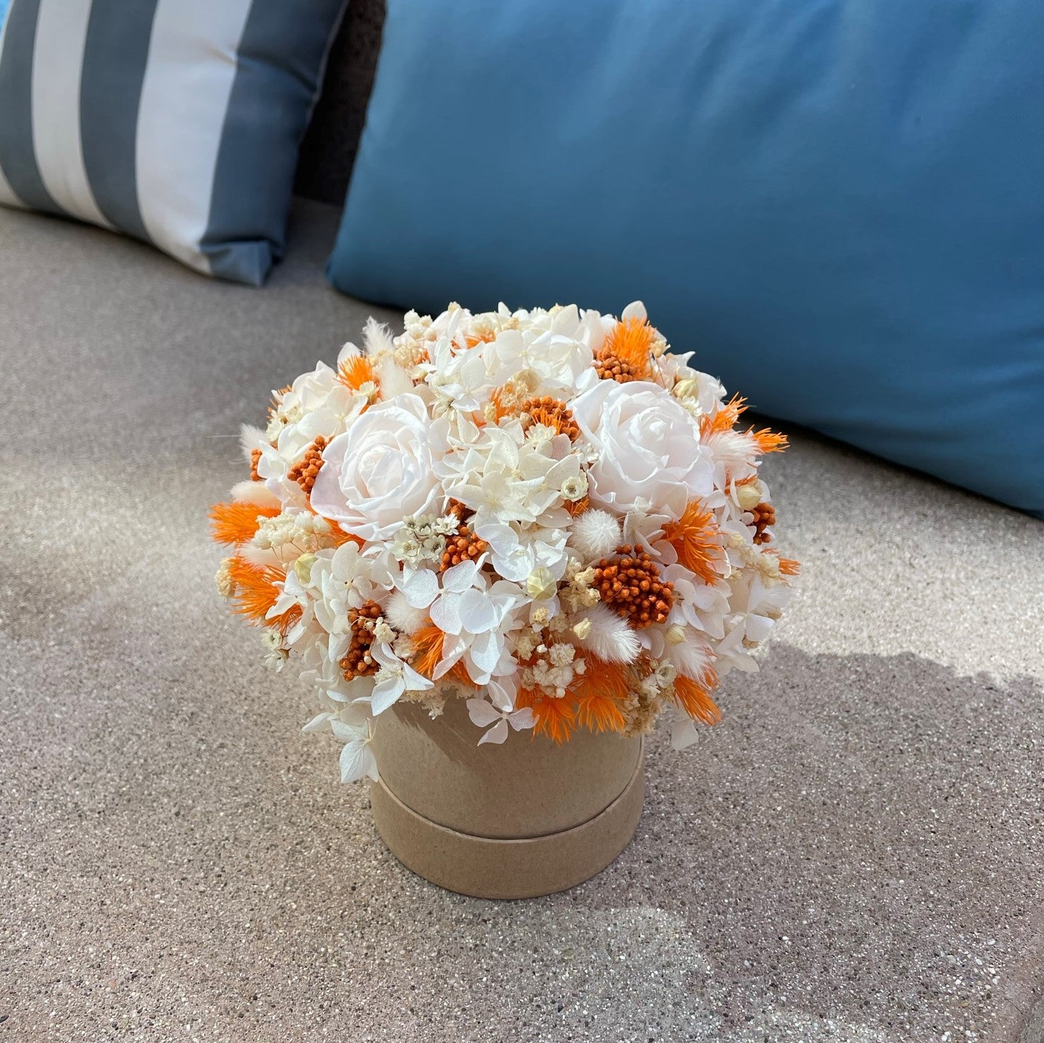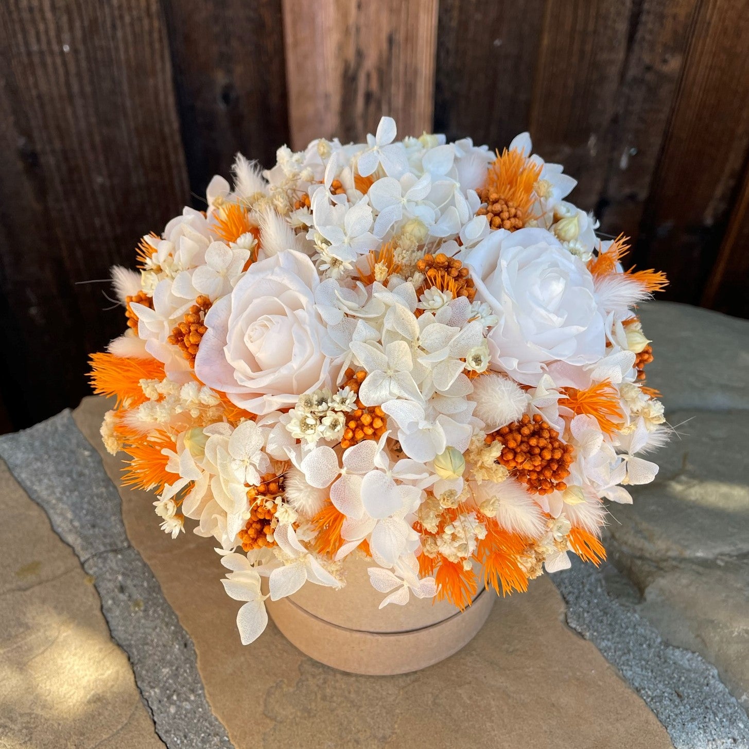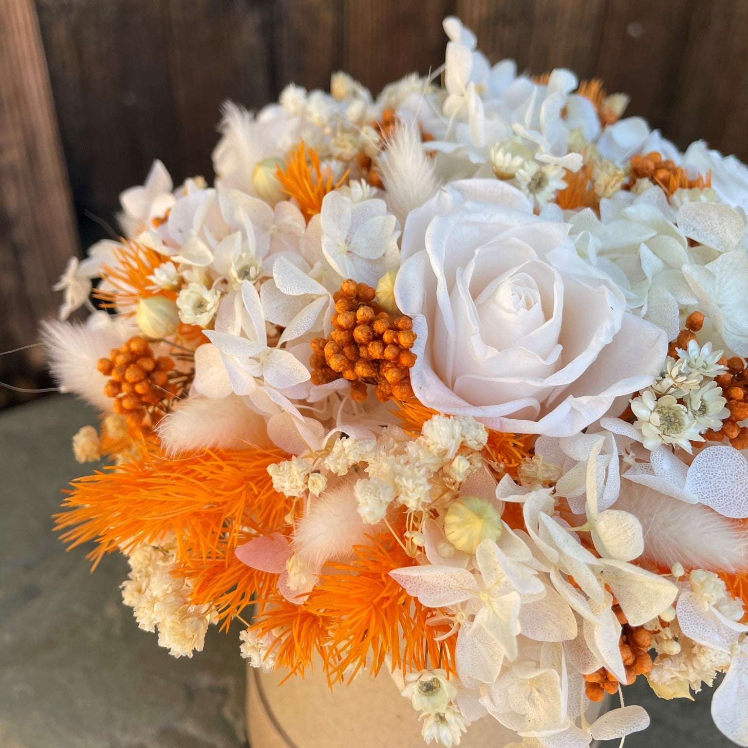Luxury Flower Arrangement with Preserved Roses and Dried flowers. Perfect Gift. Cute orange and white Fall custom woman gift. Everlasting Flowers.