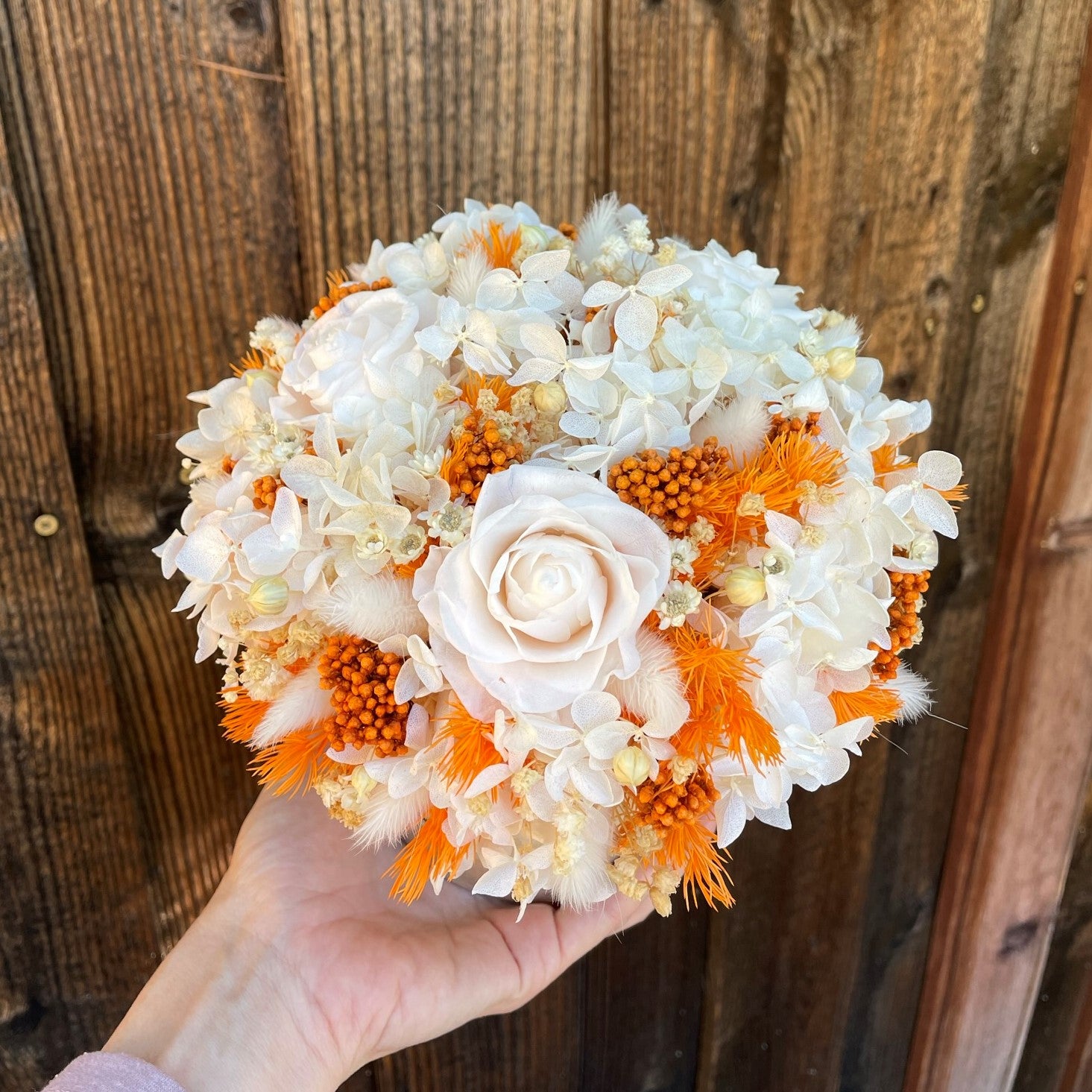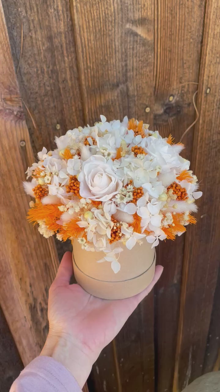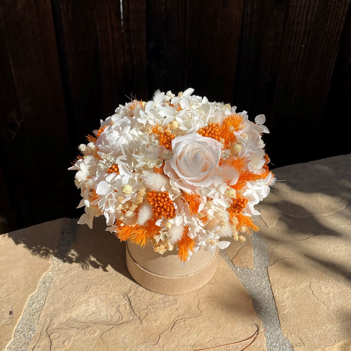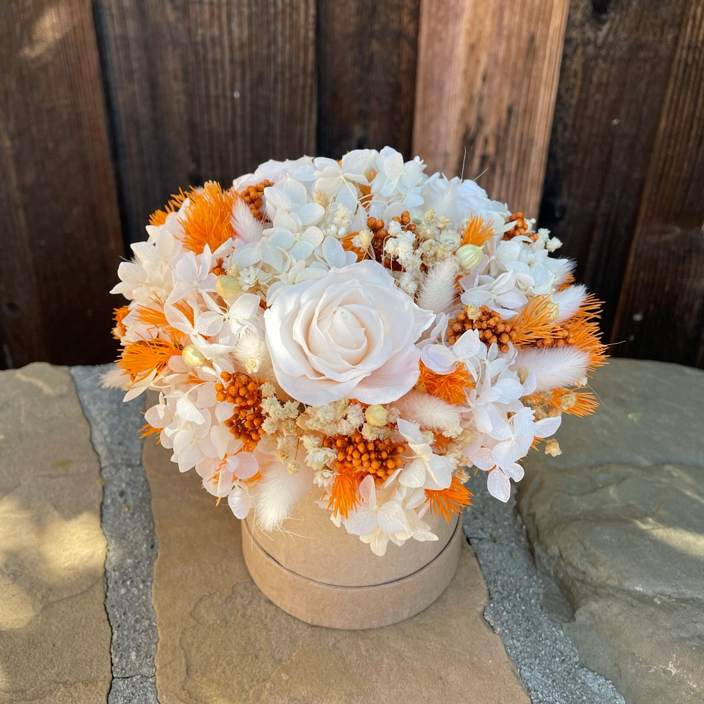 Luxury Flower Arrangement with Preserved Roses and Dried flowers. Perfect Gift. Cute orange and white Fall custom woman gift. Everlasting Flowers.